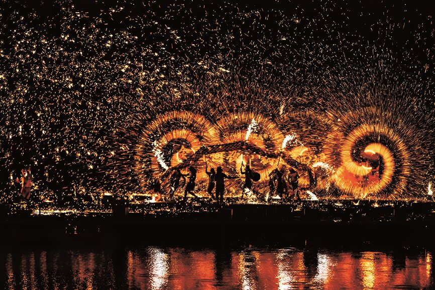 During the show, workers first melt iron in a furnace2 until it becomes extremely hot. Then, a performer uses a wooden tool to throw the liquid iron toward a tall frame covered with willow branches. When the iron hits the branches, thousands of bright sparks fly into the sky, much like fireworks.